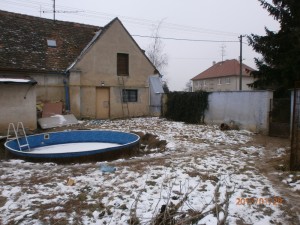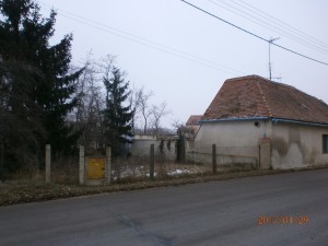 s drátěnou brankou. Vlevo od domu je zahrada oplocená plotem z drátěného pletiva na betonových sloupcích.